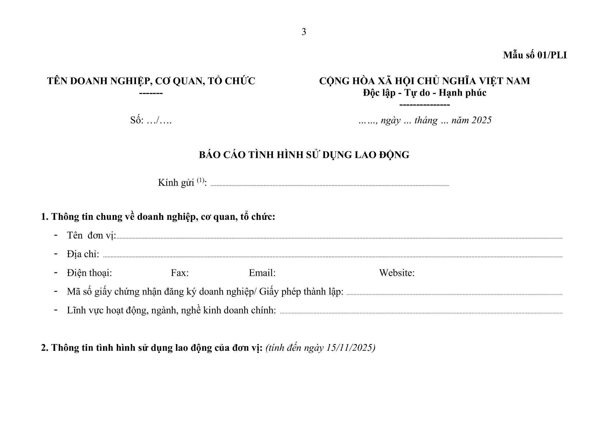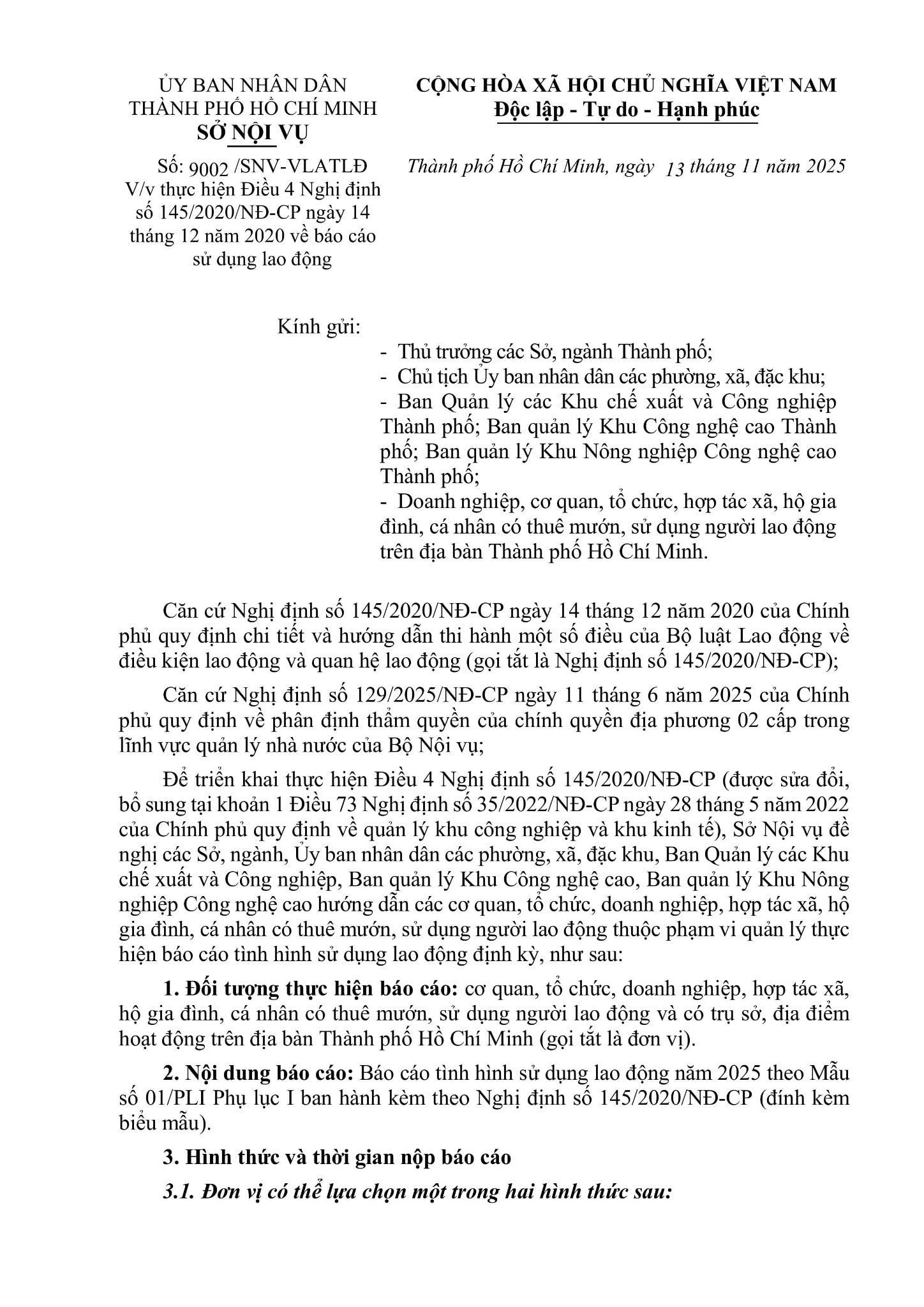 Căn cứ điều 4 Nghị định số 145/2020/NĐ-CP ngày 14 tháng 12 năm 2020 (Nghị định số 145/2020/NĐ-CP) của Chính phủ về việc triển khai thực hiện nội dung báo cáo tình hình sử dụng lao động trên địa bàn, Sở Nội Vụ đề nghị Sở, Ngành, Phòng Nội Vụ thành phố Thủ Đức và các quận, huyện, Ban Quản lý các Khu chế xuất và Công nghiệp Thành phố, Ban quản lý Khu Công nghệ cao Thành phố thông tin, hướng dẫn các cơ quan, tổ chức, doanh nghiệp (gọi tắt là đơn vị), cụ thể như sau: